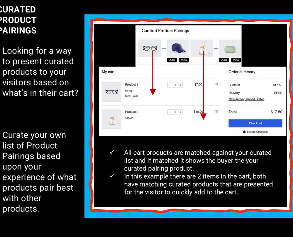 Curate your own list of Product Pairings based upon your knowledge of what products pair best with other products. Simply link the pairing to the product and via AI product matching in the Cart the pairing product can be quickly added to the Cart.